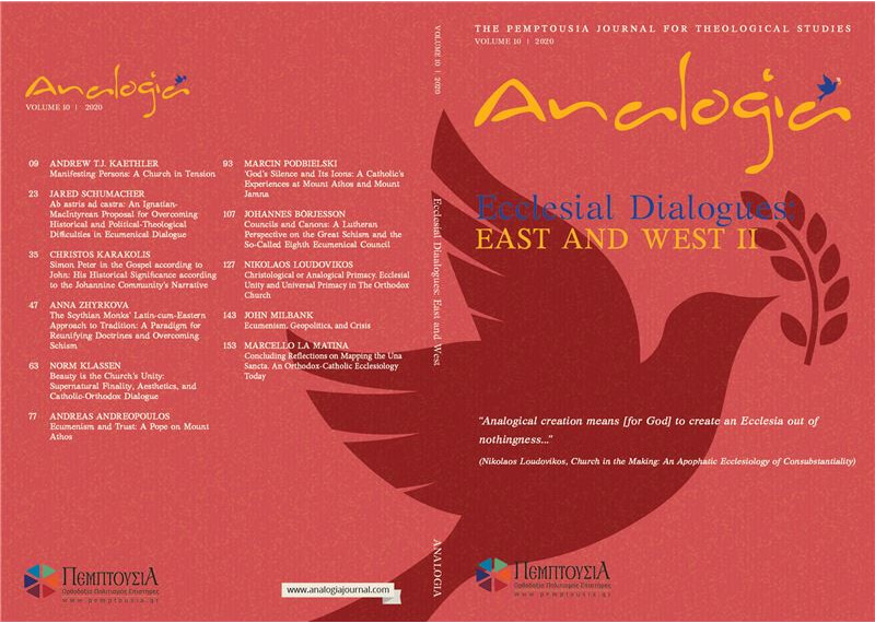Ecclesial Dialogues: East and West II (i.e., Analogia 10) starts with the Senior Editor of Analogia, Revd Professor Nicholas Loudovikos (Orthodox, University Ecclesiastical Academy of Thessaloniki, University of Winchester, IOCS Cambridge, Orthodox Secretary of the ‘St Irenaeus’ Joint Catholic-Orthodox International Working Group) and his paper on ‘Christological or Analogical Primacy: Ecclesial Unity and Universal Primacy in the Orthodox Church’, according to which ‘the only way Christ makes himself analogically present as the head of his Church, through a universal Primate, is as manifestation of a consubstantializing Synodality’. Professor Andrew TJ Kaethler (Catholic, Catholic Pacific College), in his ‘Manifesting Persons: A Church in Tension’, begins from a theological notion of personhood in order to provide a broad framework or an imaginative construct to conceive of Church unity, in light of Joseph Ratzinger’s and Romano Guardini’s respective theologies. Kaethler suggests that the East and West will, perhaps, most flourish in a united tension, a coming together of difference rather than a complete dissolving of our respective distinctions. Following this, Professor Jared Schumacher (Catholic, University of Mary) formulates ‘An Ignatian-MacIntyrean Proposal for Overcoming Historical and Political-Theological Difficulties in Ecumenical Dialogue’, focusing on three difficulties in achieving practical unity: the recognition of plurality, the problem of synthesis or integration, and the problem of orientation implicit in any synthesis.