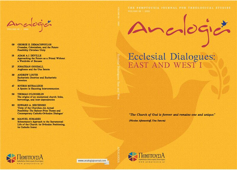 Ecclesial Dialogues: East and West I (i.e., Analogia 9) opens with Dr Sotiris Mitralexis’ (Orthodox, University of Winchester & University of Athens) ‘A Spectre Is Haunting Intercommunion’, an introduction to the conference’s problematic. Professor Edward Siecienski’s (Orthodox, Stockton University) paper follows, entitled ‘Unity of the Churches—An Actual Possibility: The Rahner-Fries Theses and Contemporary Catholic-Orthodox Dialogue’, highlighting from a contemporary perspective the eight theses that Karl Rahner, SJ and Heinrich Fries proposed in 1983, in the hope of healing Christianity’s many divisions. Revd Professor Thomas O’Loughlin (Catholic, University of Nottingham) then proceeds in his ‘The Origins of an Ecumenical Church: Links, Borrowings, and Inter-dependencies’ to examine the ecclesiology of early churches as nodes within a network, established and maintained by constant contact and by those who saw it as part of their service/vocation to travel between the churches; this culture of links, of sharing and borrowing, could perhaps form a model for a practical way forward today towards a renewed sense of our oneness in Christ. In ‘Crusades, Colonialism, and the Future Possibility of Christian Unity’, Professor George Demacopoulos (Orthodox, Fordham University) presents the historical conditions more extensively laid out in his recent monograph Colonizing Christianity: Greek and Latin Religious Identity in the Era of the Fourth Crusade (New York: Fordham University Press, 2019) in order to develop a more constructive theological argument regarding the ecumenical implications of that historical work. Revd Professor Andrew Louth (Orthodox, Durham University) focuses in his ‘Eucharistic Doctrine and Eucharistic Devotion’ on comparing the Western Rite of Benediction, Exposition of the Host and adoration, with the Liturgy of the Presanctified Gifts in the East; the nature of Eucharistic devotion expressed in these two rites is in most ways strikingly different, and this leads Revd Professor Louth to highlight differences that are rather rarely discussed in ecumenical discussions. Revd Dr Manuel Gonçalves Sumares (Orthodox, Catholic University of Portugal, Braga) centres on the late Fr Alexander Schmemann (and Sergius Bulgakov, among many others) in his ‘Schmemann’s Approach to the Sacramental Life of the Church: its Orthodox Positioning, its Catholic Intent’. Revd Professor Adam AJ DeVille (Catholic, University of Saint Francis) offers an Eastern Catholic perspective in his ‘Approaching the Future as a Friend Without a Wardrobe of Excuses’, including moral questions around marriage and divorce, historiographical and liturgical-hagiographical questions centred on the canonization and commemoration of saints in one communion who left and/or were used in conciliar debates and liturgical texts to condemn the sister communion; and questions of synodal organization and structures in both Catholicism and Orthodoxy in the face of centralizing tendencies. The first issue concludes with a rich Anglican perspective presented by the Rt Revd Jonathan Goodall, Bishop of Ebbsfleet and Archbishop of Canterbury’s Representative to the Orthodox Church: in his ‘Anglicans and the Una Sancta’, Bishop Jonathan stresses the Anglican self-understanding as ‘part of the One, Holy, Catholic and Apostolic Church’.